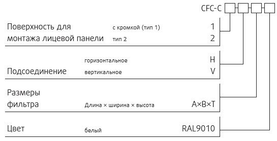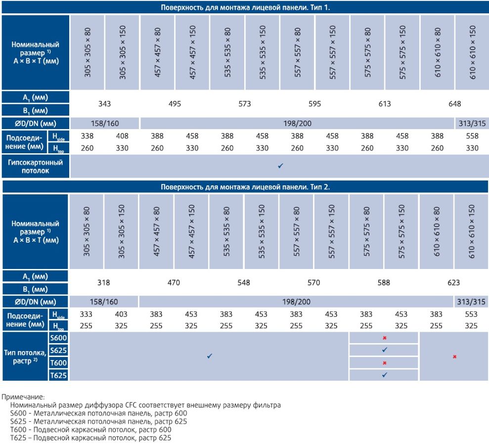 Диффузор CFC состоит из корпуса, фильтра, лицевой панели и монтажной рамы (в случае, если потолок не гипсокартонный). Все эти элементы имеют отдельные артикулы. Стандартно диффузоры поставляются с HEPA-фильтрами класса H14 с резиновым или гелеобразным уплотнением (другие фильтры по запросу).