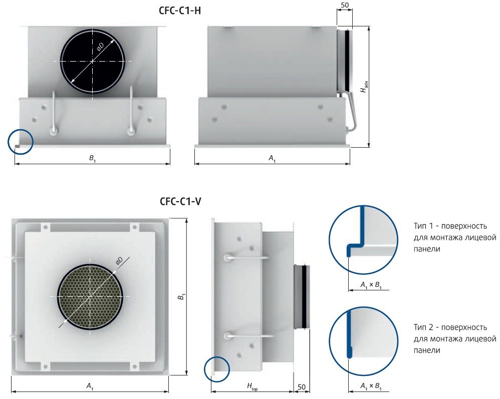 Герметичный корпус диффузора CFC изготовлен из листовой стали и окрашен краской RAL9010-30. Все стыки конструкции корпуса спаяны для обеспечения полной герметичности. Стыки корпуса типа B перед фильтром спаяны точечной сваркой и обеспечивают достаточную герметичность для помещений, где не требуется абсолютная герметизация. С корпусами типа C, B, R, W используются HEPA-фильтры с уплотнением из неопрена (синтетический каучук), с корпусами типа G - HEPA-фильтры с гелевым уплотнением. Установку фильтра в корпус облегчают 4 прижимных механизма (тип C, B, R, W) и 4 пружинных механизма (тип G). Корпуса изготавливаются 2 типов - поверхность (для монтажа лицевой панели диффузора) с кромкой (тип 1) или без (тип 2). На корпус 2 типа лицевая панель диффузора устанавливается при помощи 1 центрального болта в монтажной раме или при помощи 4 угловых болтов в корпусе.