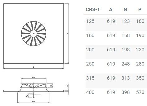 CRS-T - квадратный потолочный вихревой диффузор для подвесных потолков с фиксированными направляющими лопатками. Возможно использования в приточных и вытяжных системах. В сравнении с традиционными диффузорами, вихревые диффузоры обладают более высокой рассеивающей способностью, что позволяет использовать их при больших расходах воздуха и разности температур от -10 до +10°С. Образование турбулентных вихрей способствует более быстрому смешиванию потока приточного воздуха с воздухом помещения, т.е более быстрому распределению температуры потока и его рассеиванию. Кроме того, вихревые диффузоры CRS-T могут использоваться в системах с переменным расходом воздуха (VAV) без риска срыва потока при изменениях расхода воздуха в пределах от 100% до 25%.