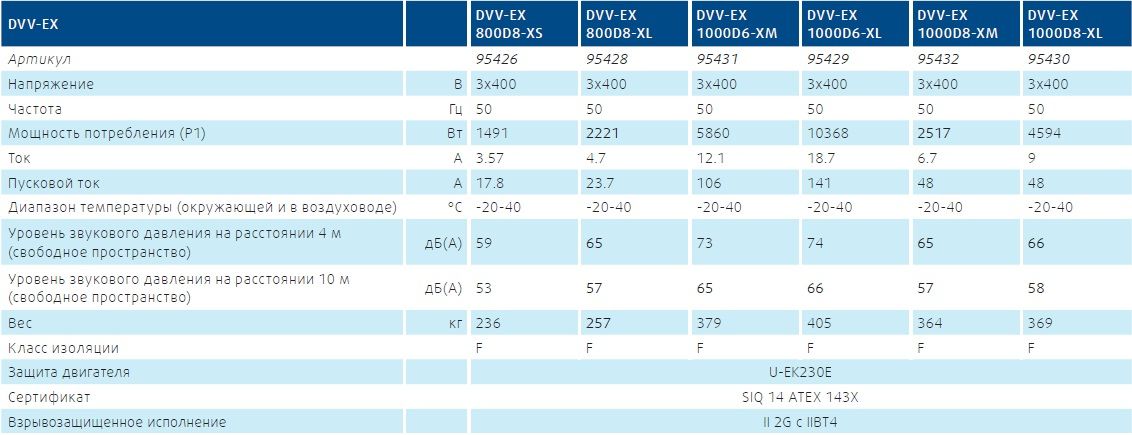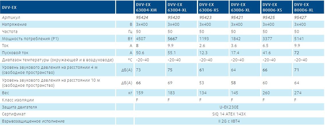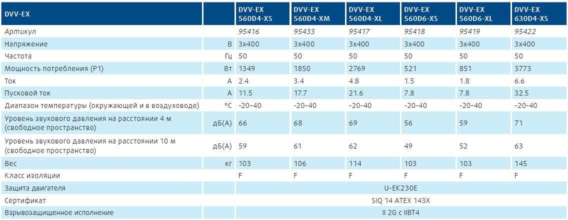 Вентиляторы отвечают требованиям температурных классов с T1 по T4. Кроме этого, данные вентиляторы подходят для удаления потенциально взрывоопасных газов в зоне 1 и 2, а также сред с содержанием веществ группы IIA и IIB. Также возможно удаление водородосодержащих сред IIC.