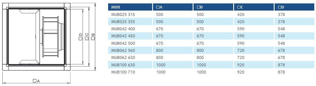 Монтаж: Съемные панели корпуса обеспечивают большой выбор вариантов монтажа. MUB допускают монтаж на кровле (с дополнительными принадлежностями). Возможна установка на притоке и на вытяжкев любом положении.