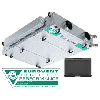 Systemair Topvex FC02 HWL-R-CAV. Компактный подвесной приточно-вытяжной агрегат с противоточным рекуператором в плоском корпусе с водяным нагревателем низкой мощности и выносным пультом управления. Правая сторона обслуживания.