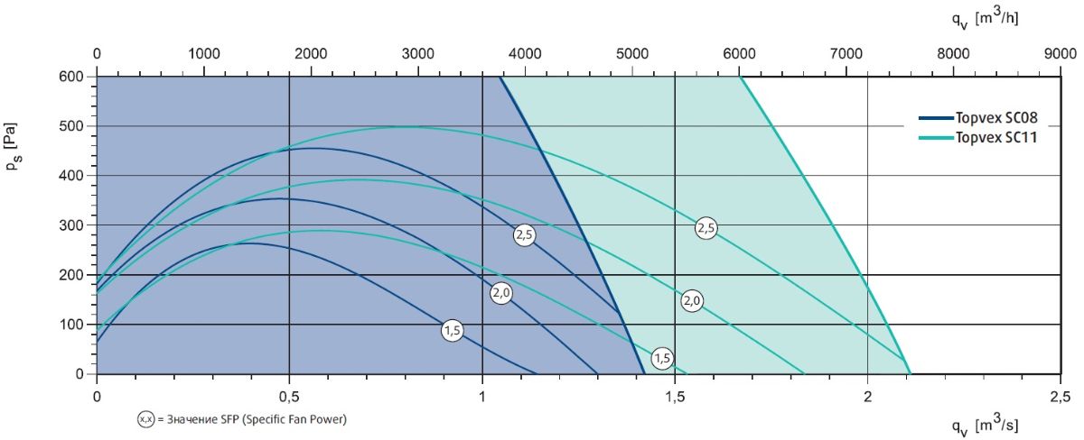 Topvex SC разработаны в соответствии с высокими требованиями по энергосбережению, обеспечивают высокий КПД рекуперации и низкое потребление электроэнергии. Чтобы гарантировать высокую эффективность утилизации тепла, противоточный рекуператор разработан для низких скоростей воздуха, и поэтому имеет низкое сопротивление. Приточный и вытяжной фильтры разработаны с минимизацией потерь давления без потерь качества фильтрации. Низкие внутренние потери давления являются важной составляющей для сокращения энергопотребления. Вентиляторы прямого привода с EC технологиями были очевидным выбором из-за высокой эффективности. EC двигатели, при регулировке скорости вращения, имеют на 15-20% ниже энергопотребление по сравнению со стандартными асинхронными двигателями, регулируемыми частотными преобразователями.